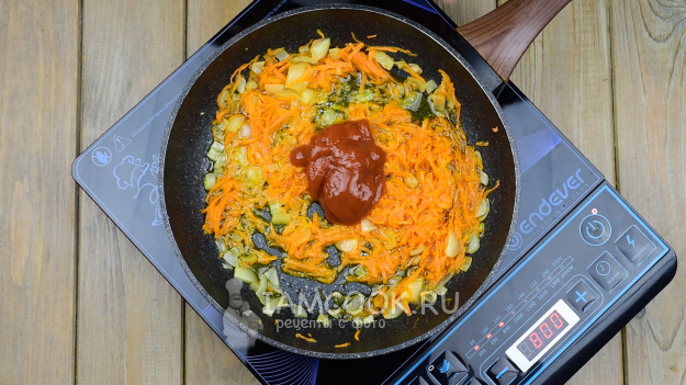 Добавим томатный соус к овощам, перемешаем и через 2-3 минуты сковороду снимем с плиты.