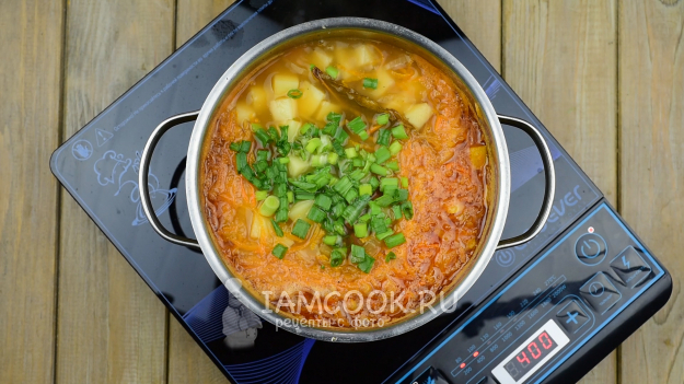 Добавим мелко нашинкованный зеленый лук и через 5-6 минут кастрюлю с готовыми щами снимем с плиты.
