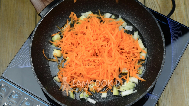 Лук и морковь выложим на сковороду, в которую чуть ранее залили растительное масло. Будем пассеровать на среднем огне измельченные овощи до мягкости, регулярно помешивая лопаткой.