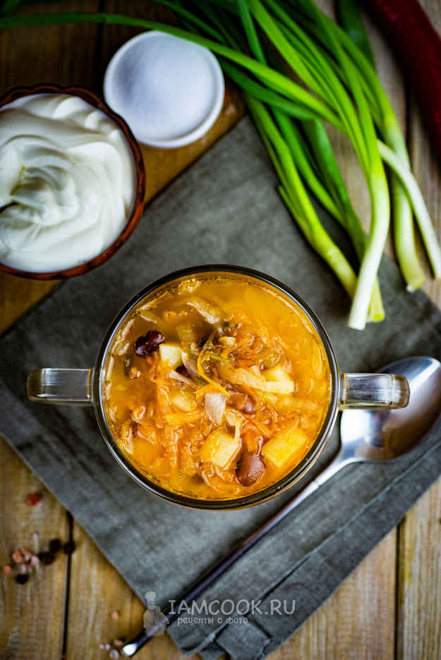 Разливаем горячие постные щи из квашеной капусты с фасолью по тарелкам и подаем к столу со сметаной.