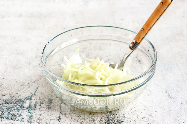 Сначала нужно замариновать лук. Даже не замариновать, а придать ему вкус. Для этого нарежьте лук перьями и залейте лимонным соком, затем добавьте к нему сахар и хорошо перемешайте, чтобы сахар растаял. Количество сахара можно уменьшить, тут уж по вкусу.
