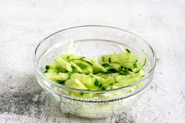 Нарежьте свежий огурец соломкой, сложите в салатник к луку.