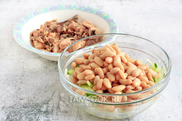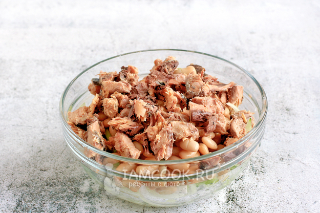 С фасоли слейте жидкость и добавьте фасоль в салат. Она может быть и красной, тогда салат получится еще ярче.