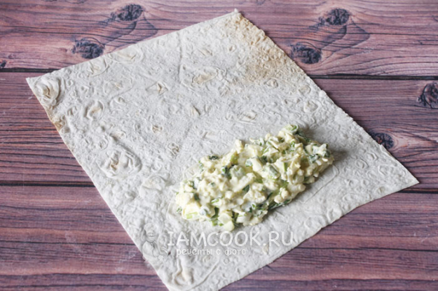Берем по листику лаваша и выкладываем начинку - ее должно хватить на 6 пирожков.