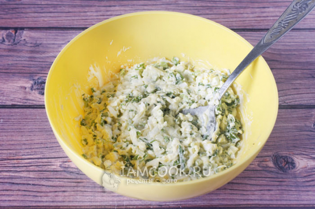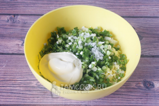 Перекладываем в широкую миску подходящего размера яйца и лук, добавляем соль по вкусу (буквально щепотку, так как соль есть в майонезе) и майонез.