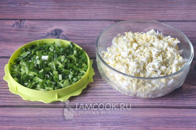Готовим начинку. Яйца отвариваем 10 минут до состояния вкрутую, перекладываем их на некоторое время в холодную воду, чтобы они остыли. Затем чистим их и трем на крупной терке. Лук моем и измельчаем.