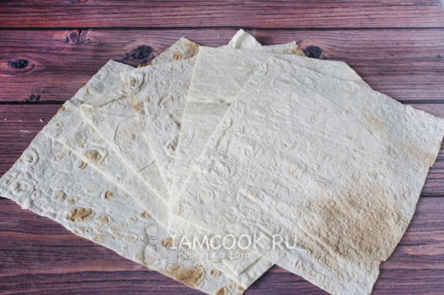 Лаваш разрезаем ножницами на равнозначные прямоугольники. У меня вышло 6 штук размером примерно 20 на 15 см.