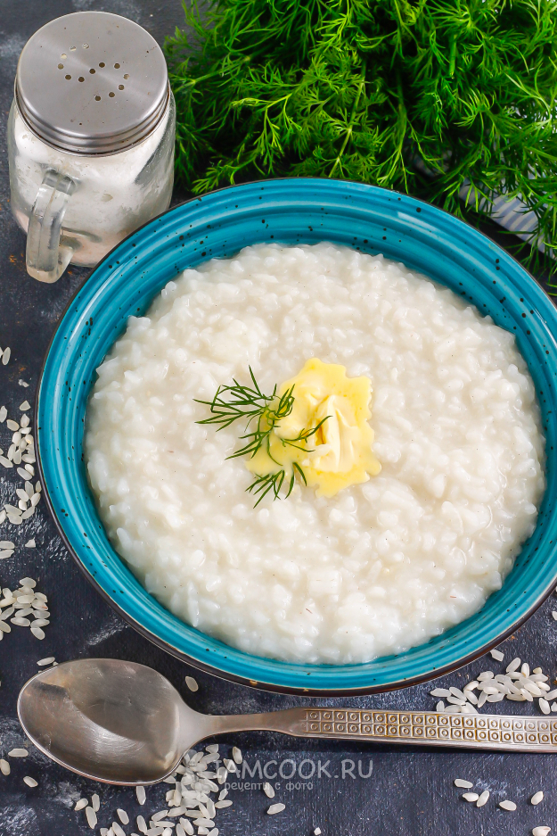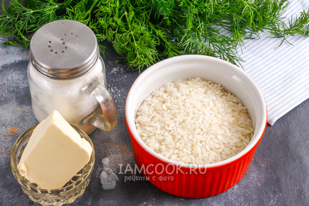 Возьмите необходимые ингредиенты для приготовления вязкой рисовой каши на воде.