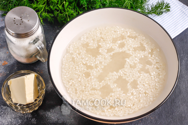 Рис промойте в воде. Много раз можно не промывать, вымывая крахмал, так как он как раз и нужен для создания запланированного блюда.
