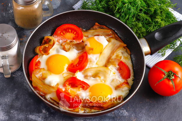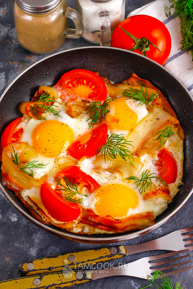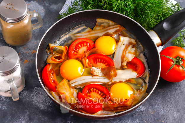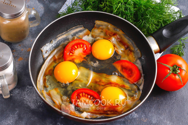 По желанию можете использовать крышку, но буквально на 2-3 минуты, иначе потом под крышкой желтки станут плотными, а они должны остаться жидкими. Когда белки поджарятся, а желтки останутся жидкими - яичница с беконом и помидорами полностью готова!
