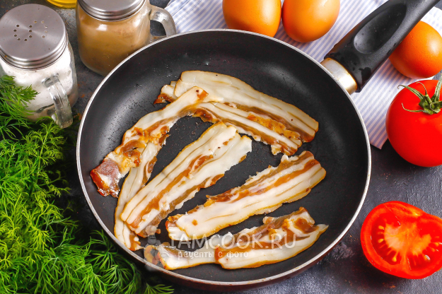 Разогрейте сковороду и выложите на нее ломтики бекона. На умеренном нагреве поджарьте примерно 1 минуту, несколько полосочек извлеките, а остальные переверните на другую сторону.