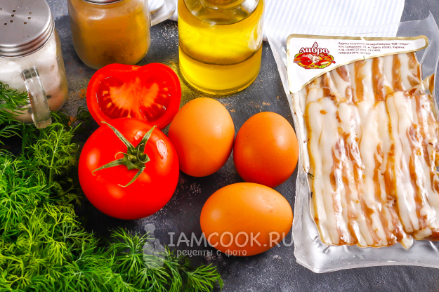 Подготовьте необходимые ингредиенты для создания красочной яичницы с беконом и помидорами на сковороде. Помидор промойте, вырежьте зеленую сердцевинку и нарежьте ломтиками.