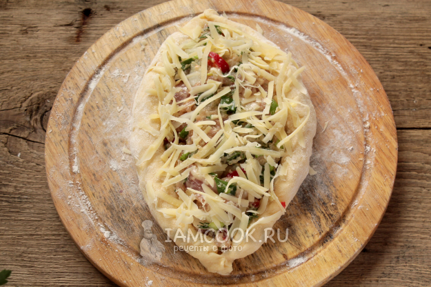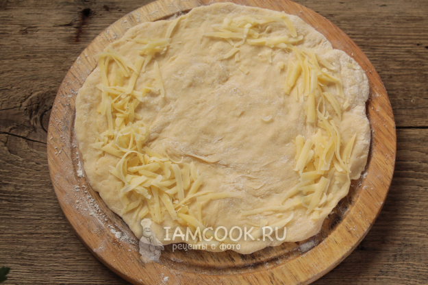 Тесто растяните круглой лепешкой, по краю насыпьте тертый сыр.