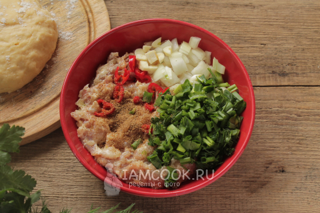 Для начинки хачапури смешайте мясной фарш, измельченные зелень, репчатый лук, чеснок, чили, приправьте молотым кориандром и солью.