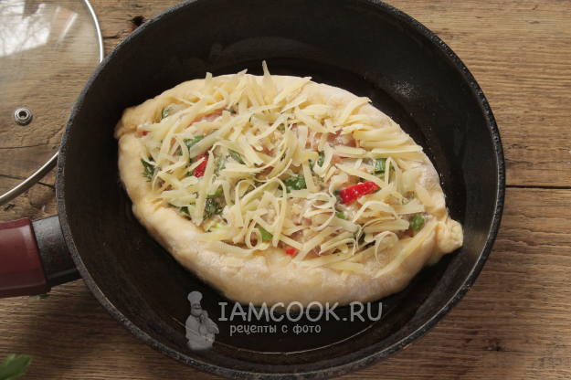 Выложите хачапури с фаршем на слегка промасленную горячую сковороду и пеките при небольшом огне под крышкой примерно 15-20 минут.