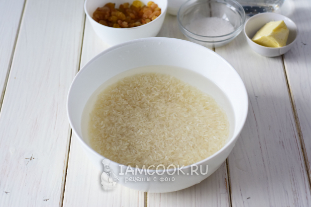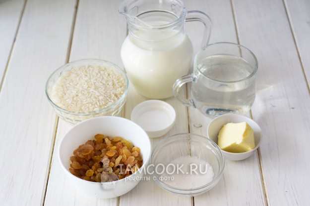 Возьмём необходимые ингредиенты для приготовления рисовой каши с изюмом в духовке на молоке.