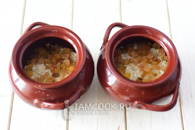 Изюм ополоснем в проточной воде, воспользовавшись ситом. Разложим изюм в равных количествах по горшочкам поверх риса.