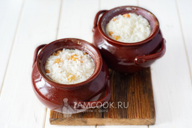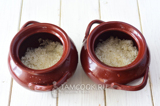 Подготовленный рис разложим по чистым горшочкам в одинаковых количествах.