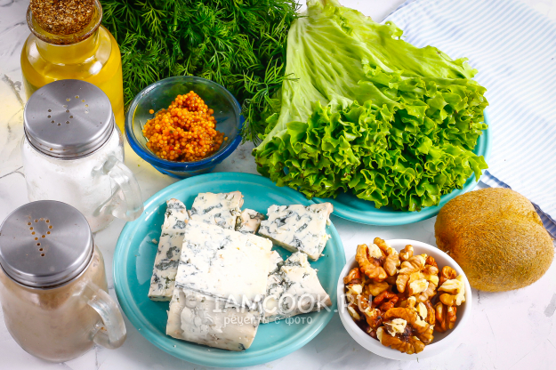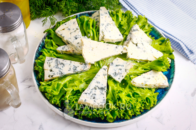 Сыр с голубой плесенью нарежьте порционными кусочками и выложите на салатные листья.