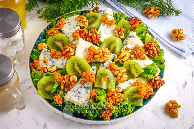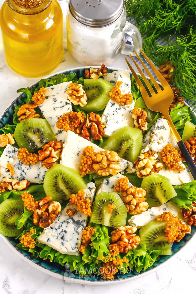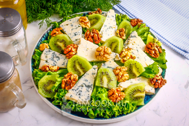 В хаотичном порядке выложите ядра грецких орехов между сыром и киви. Орехи не нужно измельчать!