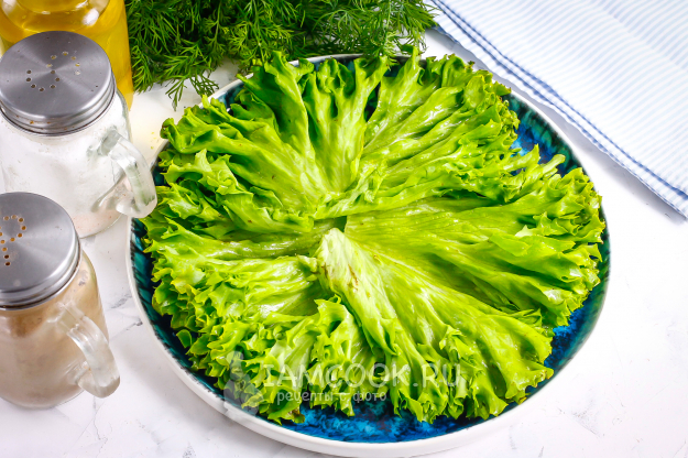 Тщательно промойте каждый лист зеленого салата, оборвите или срежьте стебли. Стряхните лишнюю жидкость или обсушите листья с помощью бумажного полотенца, салфетки. Выложите их на тарелку веером, кругом.