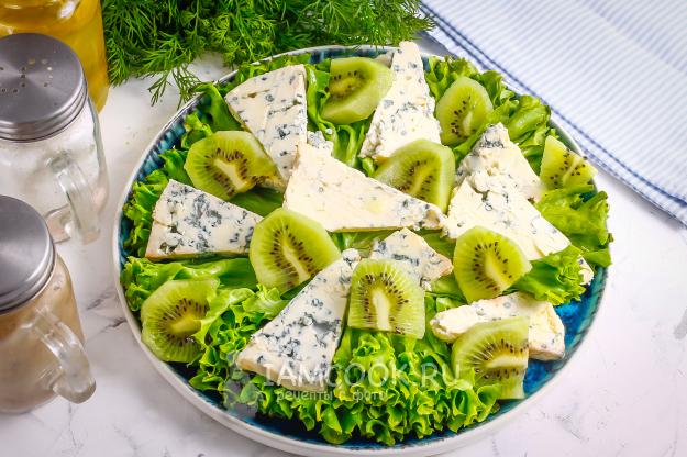 Очистите киви от кожуры, промойте в воде и нарежьте кружочками, а кружочки затем разрежьте пополам и выложите нарезку между ломтиков сыра. Желательно не мельчить салат, так как мелкая нарезка не будет привлекательно смотреться при подаче блюда к столу.