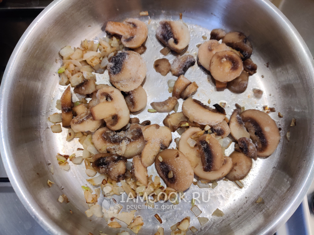 Добавьте нарезанные шампиньоны и обжарьте их несколько минут, пока не выпарится большая часть влаги, но не вся.