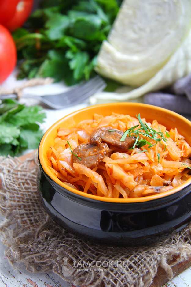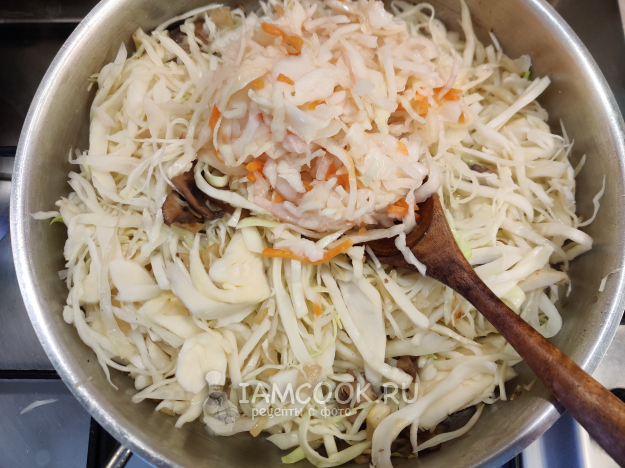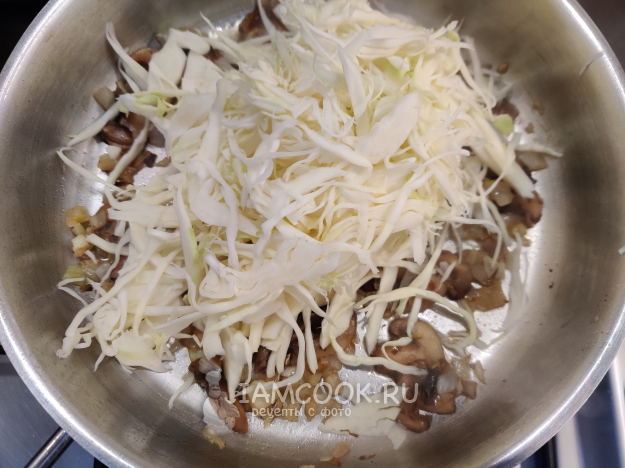 Белокочанную капусту нашинкуйте мелкой соломкой и добавьте в сковороду.