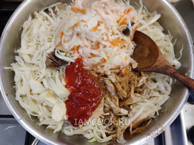 Добавьте томатный соус. Это может быть томатная паста или даже кетчуп. Осталось добавить смесь сушеных трав или любых специй, которые подходят для овощей. Перемешайте и тушите солянку с капустой и шампиньонами на сковороде под закрытой крышкой 25-30 минут на слабом огне, периодически помешивая.