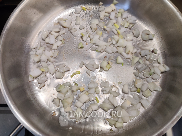 Репчатый лук мелко нашинкуйте и обжарьте на раскаленном подсолнечном масле до золотистого цвета в течение нескольких минут.