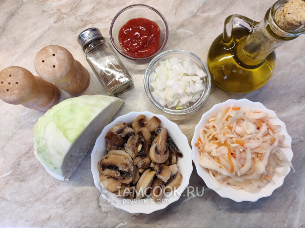 Возьмите все необходимые ингредиенты для приготовления солянки с капустой и шампиньонами на сковороде. Репчатый лук очистите от шелухи. Грибы можно брать как свежие, так и замороженные. Причем последние предварительно размораживать не нужно. Свежие нужно предварительно вымыть под проточной водой.