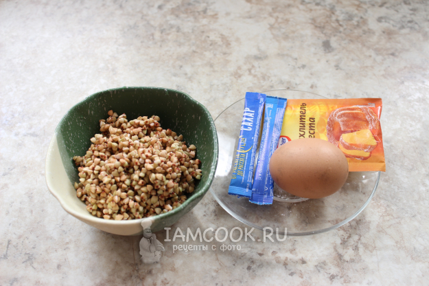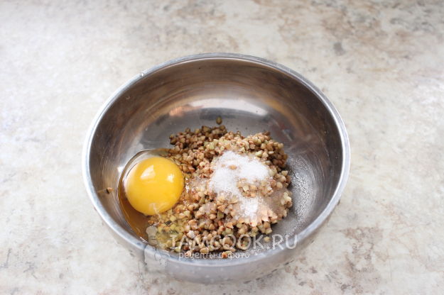 Соединяем в миске промытую зеленую гречку, яйцо, сахар, соль и разрыхлитель.