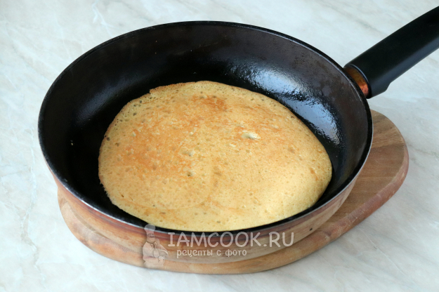 По истечению времени выльем порцию теста на хорошо разогретую сковороду и распределим его по всему дну, сформировав круглую заготовку. Учитывая консистенцию теста, растекаться оно будет очень лениво. Перед жаркой первого блина сковороду нужно смазать тонким слоем растительного масла или же использовать сковороду с хорошим антипригарным покрытием, тогда лишний жир не понадобится.