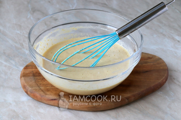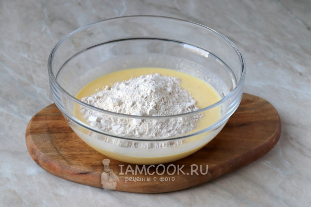После чего в кефирно-банановую основу вводим овсяную муку и разрыхлитель, перемешиваем.