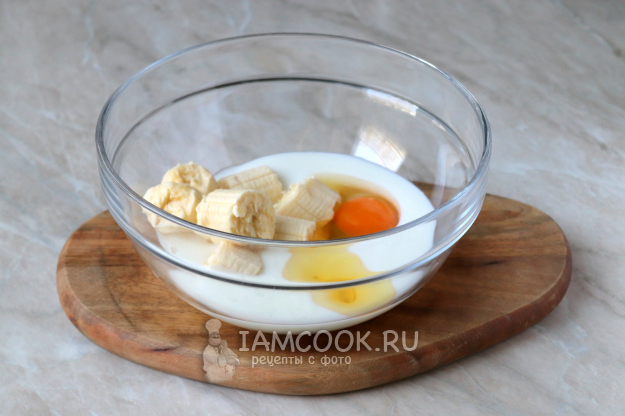 В глубокую миску наливаем кефир комнатной температуры, вбиваем яйцо, добавляем мякоть банана и столовую ложку растительного масла, желательно без запаха.
