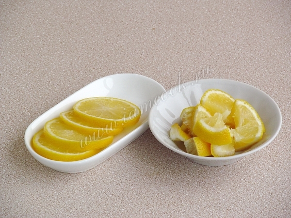 Лимон вымыть, разрезать и отрезать 4 одинаковых по толщине и диаметру кружочка, а оставшуюся часть лимона порезать ломтиками.