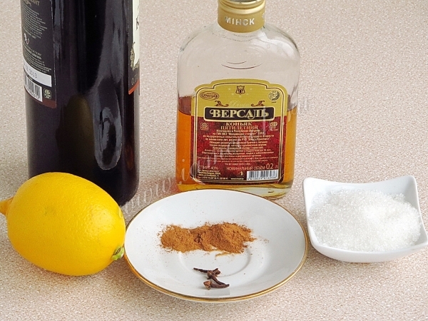Для приготовления глинтвейна нужно взять красное столовое виноградное вино, коньяк, сахар, лимон, молотую корицу и бутоны гвоздики.