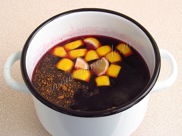 Посуду снять с плиты, добавить корицу, гвоздику, нарезанные дольками лимоны и коньяк.