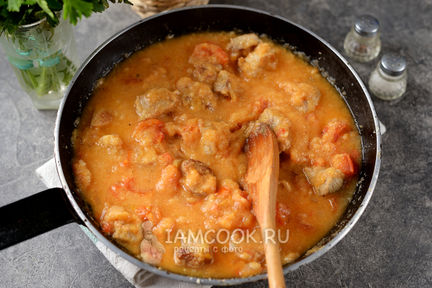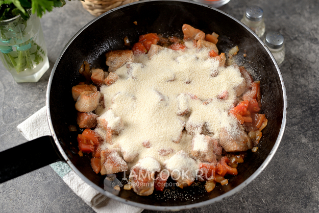 Когда помидоры станут достаточно мягкими, всыпьте манку.