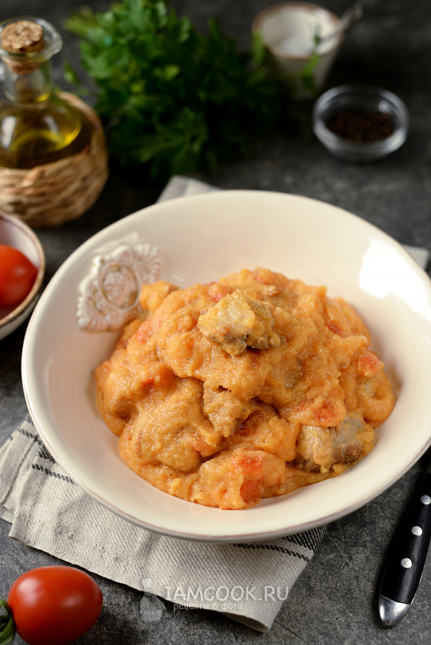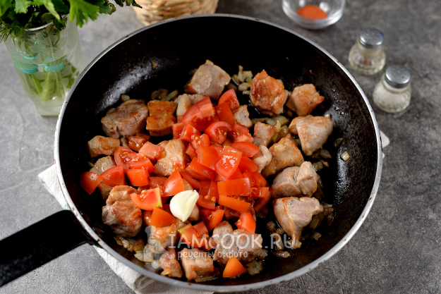 Поскольку блюдо получается сладковатым, кислинка в нем просто необходима. Помидоры нарежьте также мелкими кусочками, добавьте к свинине, положите раздавленный зубчик чеснока. Тушите овощи с мясом минут 5.