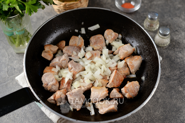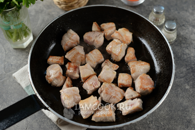 Разогрейте в сковороде растительное масло, выложите в него нарезанную мелким кубиком свинину, обжарьте на сильном огне до слегка румяной корочки. Дальше сделайте самый тихий огонь, накройте крышкой и тушите минут 20. При необходимости можно влить немного воды из чайника.