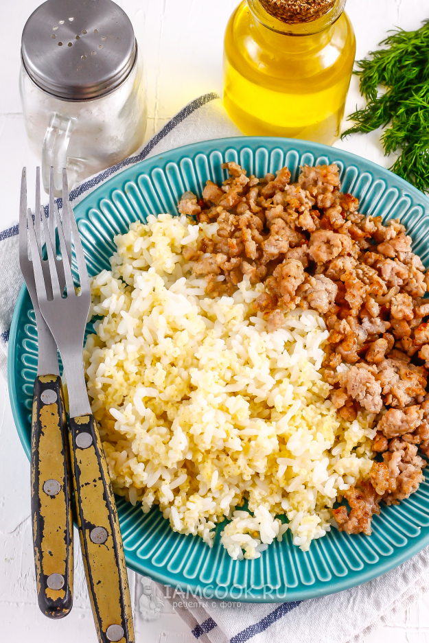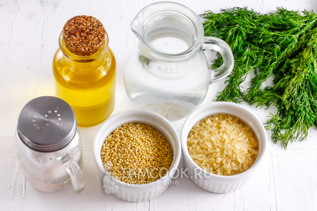 Возьмите необходимые ингредиенты для приготовления сытной рисово-пшенной каши в духовке.