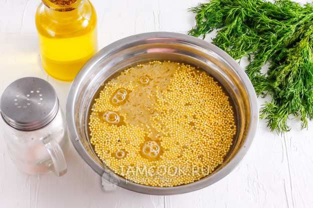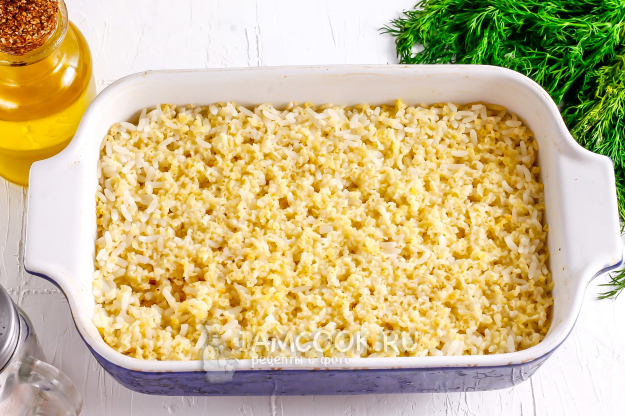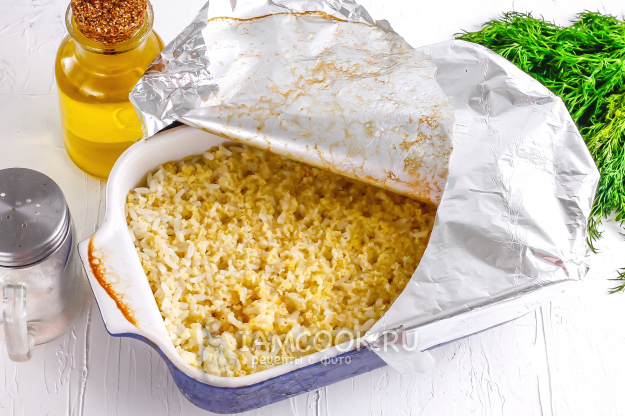 Накройте форму фольгой или крышкой и поместите рисово-пшенную кашу в духовку при 180-200 градусах.