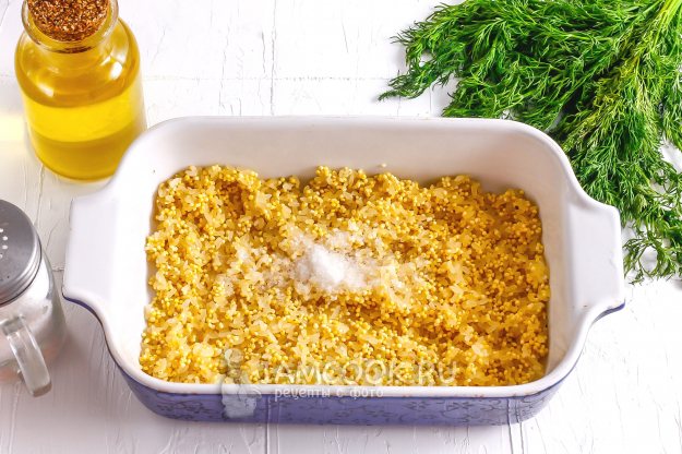 Пересыпьте промытые крупы в форму для запекания, всыпьте соль. На этом этапе можно добавить и другие специи, пряности, приправы. Если готовите сладкую кашу, то всыпьте и соль, и сахар по вкусу.