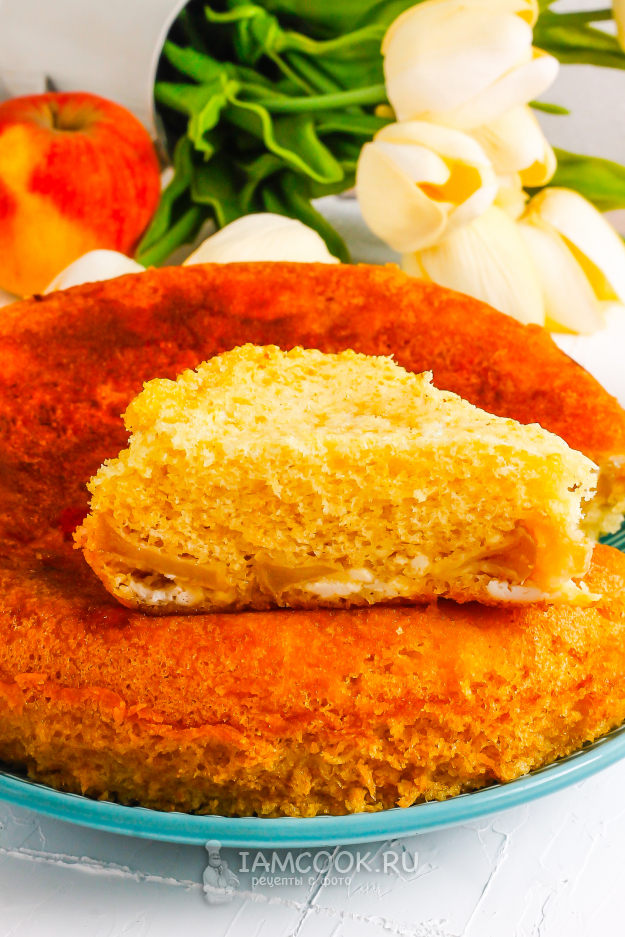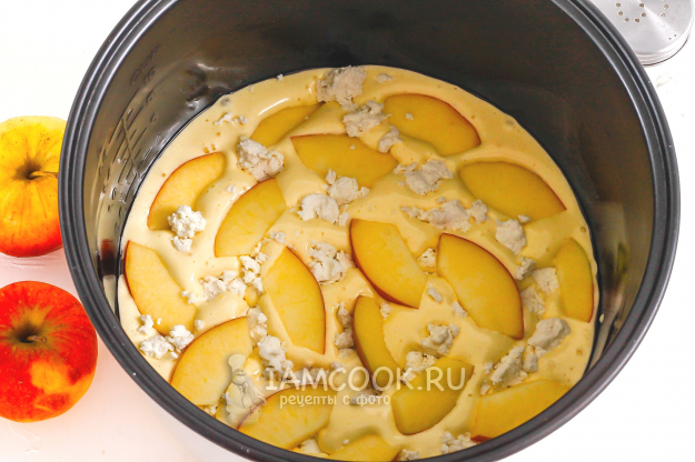 Смажьте форму растительным маслом без аромата или сливочным. Выложите в нее приготовленное бисквитное тесто. Яблоко или яблоки очистите от сердцевинки, промойте и нарежьте ломтиками. Если фрукты мелкие, то используйте два яблока, если крупные, то одно. Выложите яблочную нарезку на тесто и добавьте раскрошенный творог любой жирности. Поместите чашу на место и выпекайте шарлотку с яблоками и творогом в мультиварке на режиме "Выпечка" 45-50 минут.