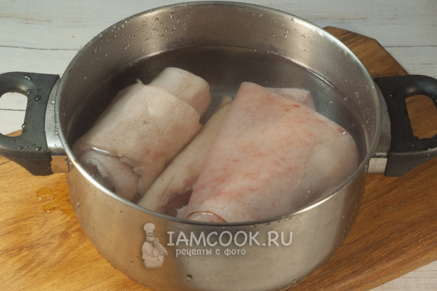 Ставим кастрюлю на огонь, доводим до кипения, снимаем пену. Накрываем кастрюлю крышкой и варим под крышкой на малом огне часа два. Шкуры должны стать мягкими. Времени может понадобиться и меньше.