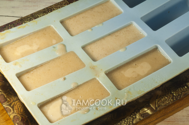 Эту эмульсию разливаем в любые формы или банки. Я разлила в силиконовую форму «Брусочки». Ставим в морозилку для застывания.