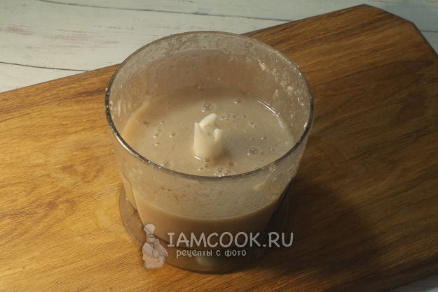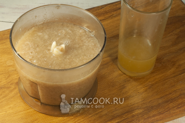 Далее порциями перетираем шкуру в блендере, добавив 10% бульона, который у нас получился при варке. В моем случае я добавила 50 мл бульона (шкур у меня было 500 г).