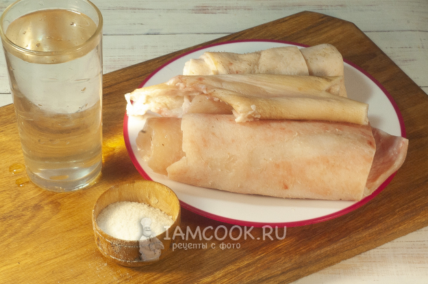 Подготовим ингредиенты, необходимые для изготовления швартенблока. Собственно, основной ингредиент — это свиная шкура. Еще понадобится вода для варки и немного соли. Шкуры хорошо промоем, зачистим от жира.