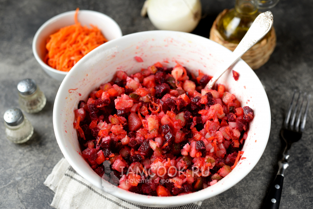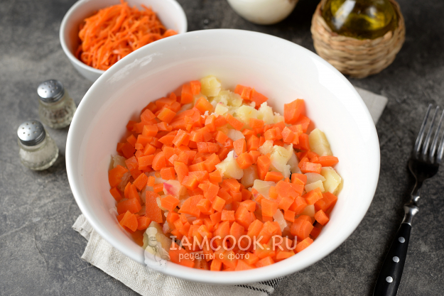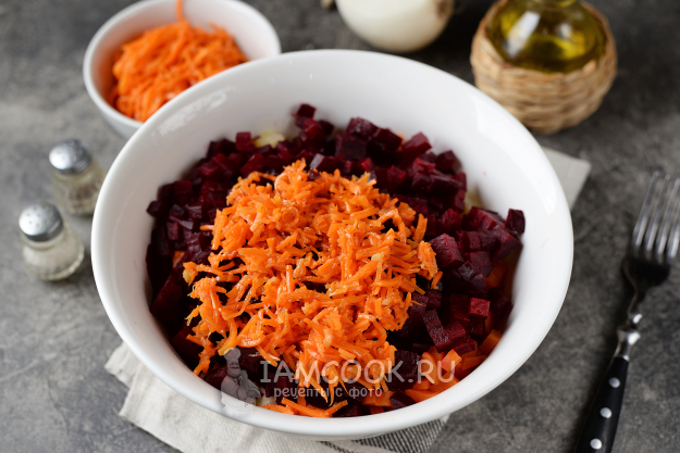 Добавьте нарезанную таким же кубиком свеклу. Морковь по-корейски я использовала средней остроты, но также можно взять и поострее. Если морковь нашинкована длинными полосками, ее нужно обязательно измельчить ножом, иначе салат будет неудобно есть в готовом виде.